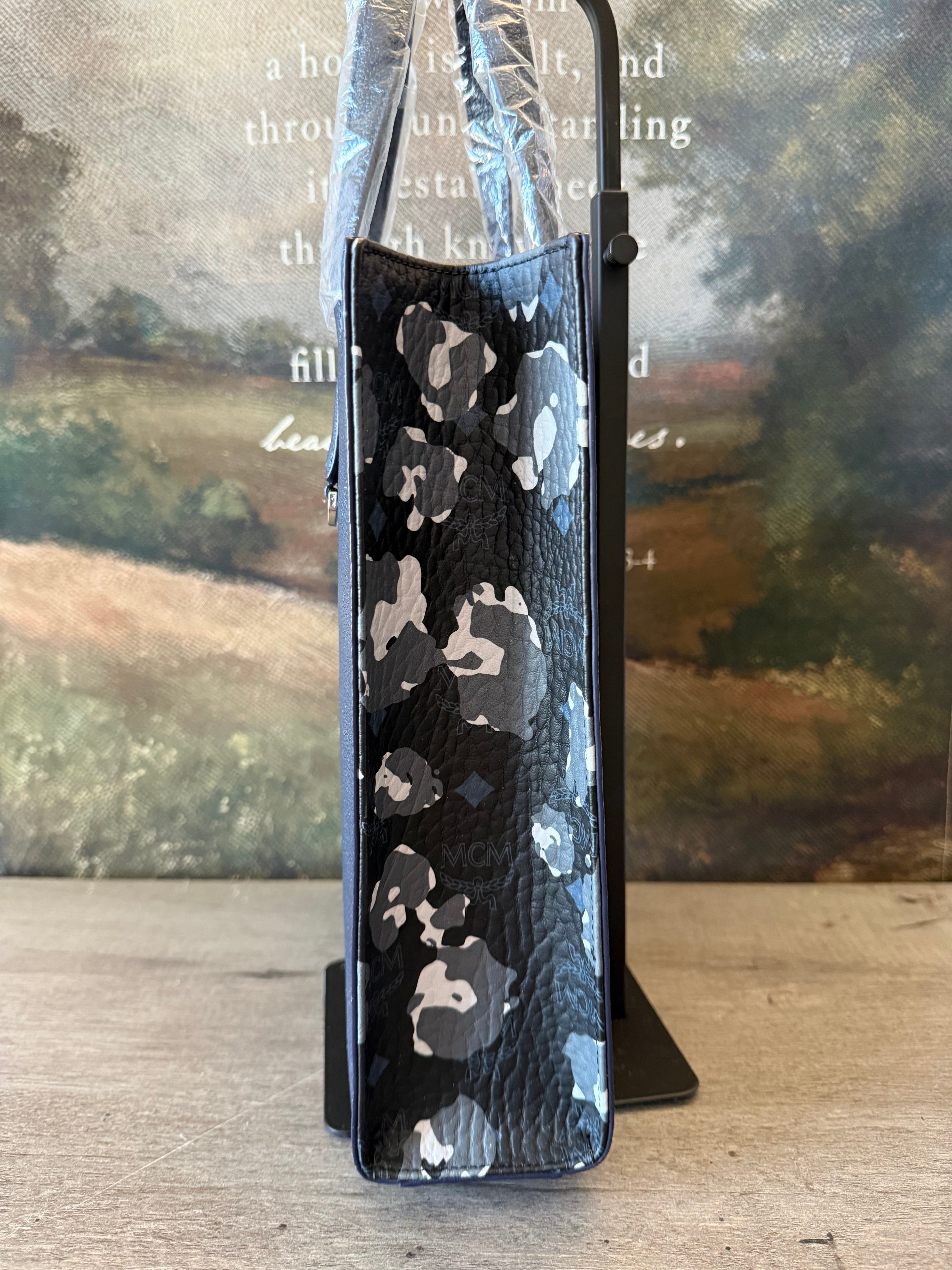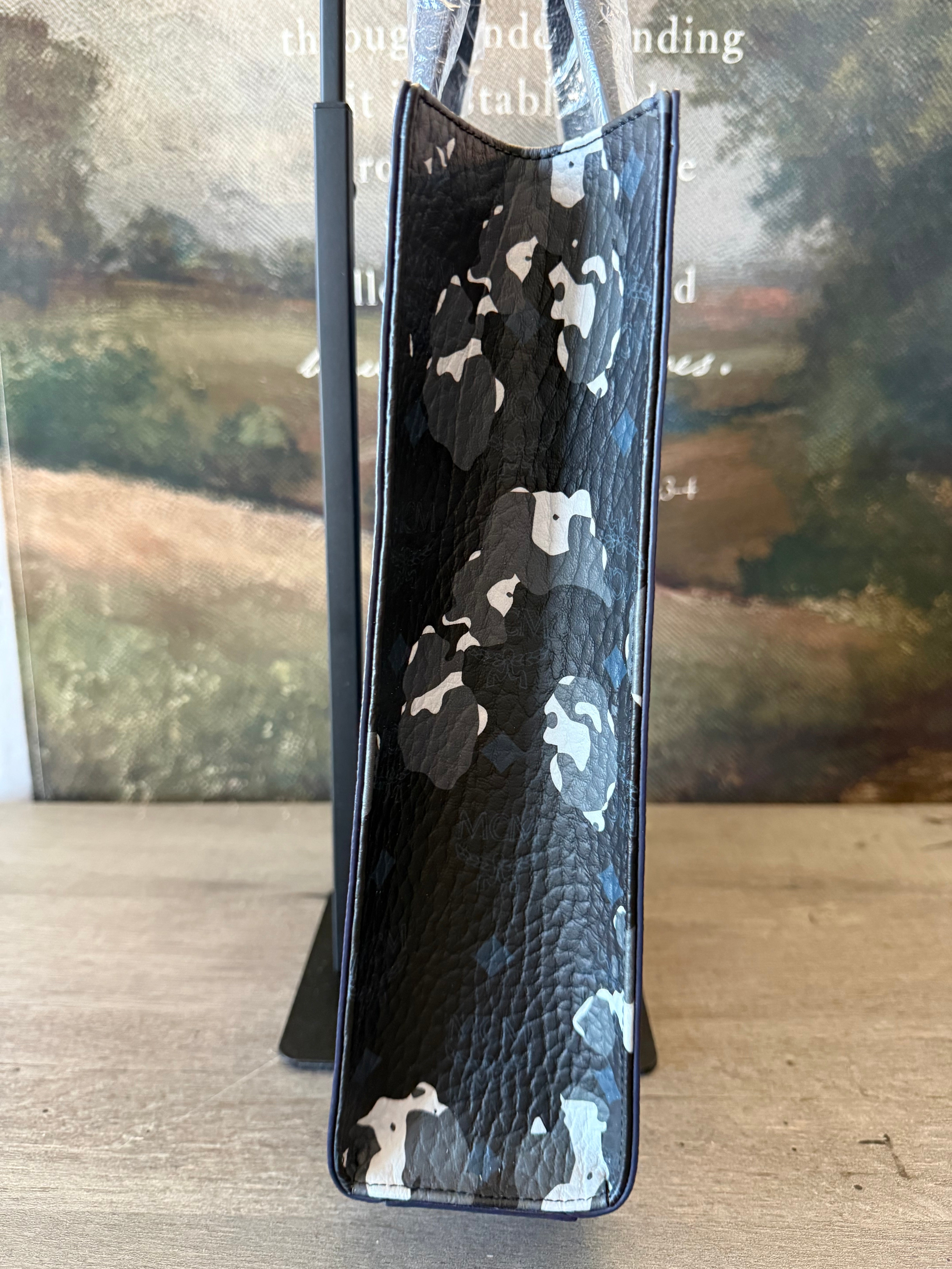 Authentic MCM structured leather tote in deep navy with camo side panels and gold München logo plate. Brand new with...